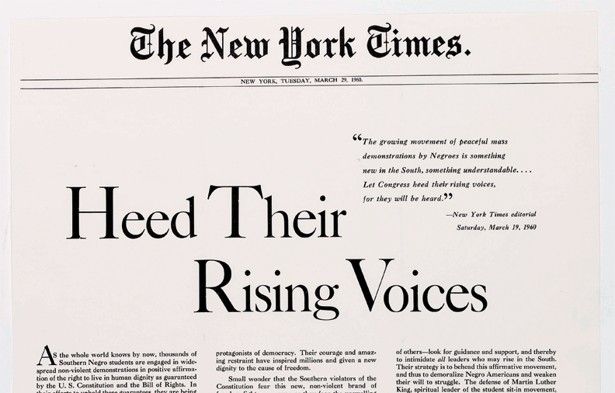 Năm 1960, New York Times xuất bản một phụ trương quảng cáo tràn trang của một nhóm các nhà hoạt động quyền dân sự, có tiêu đề “Heed their rising voices” (Hãy lắng nghe những tiếng nói đang lên của họ). Họ công khai chỉ trích cảnh sát thành phố Montgomery thuộc tiểu bang Alabama vì đã đối xử tệ hại với những người biểu tình ôn hòa, trong đó có mục sư Martin Luther King – biểu tượng của phong trào đấu tranh vì quyền dân sự thời bấy giờ. Phần lớn nội dung của phụ trương này là đúng sự thật, nhưng có một số thông tin sai.