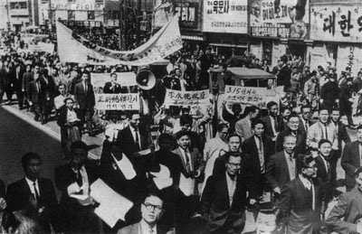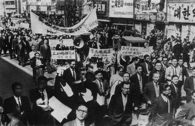 Một buổi xuống đường của người lao động và sinh viên Hàn Quốc trong phong trào Cách Mạng Tháng Tư. Phong trào đã thành công trong việc lật đổ chính quyền toàn trị của nền Đệ Nhất Cộng Hòa, kèm theo sự từ chức của Syngman Rhee.