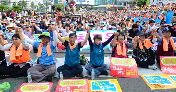 Các giáo viên và công chức giáo dục Hàn Quốc biểu tình phản đối lệnh cấm hoạt động KTU của cơ quan có thẩm quyền.