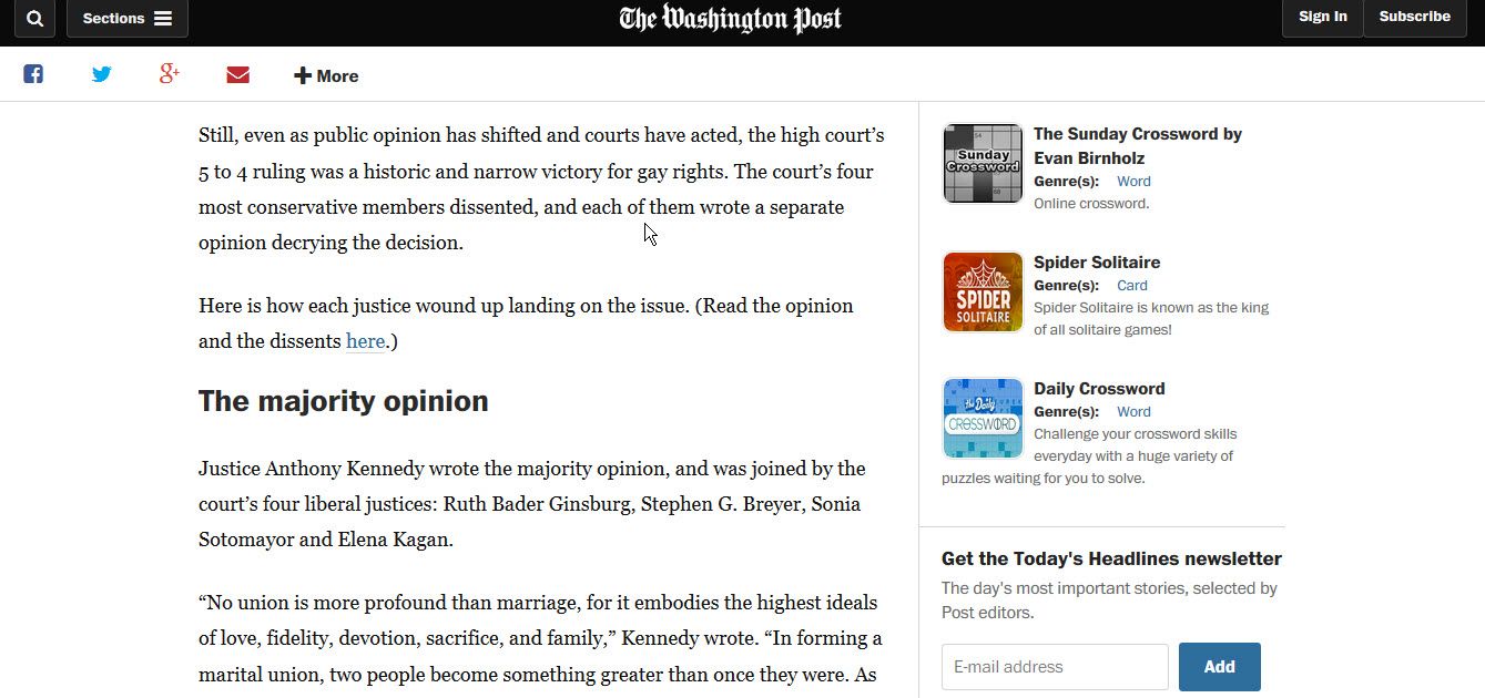 Ảnh chụp một phần phân tích luận điểm của các thẩm phán trong án lệ chính thức hợp pháp hóa hôn nhân đồng tình của tờ The Washington Post.