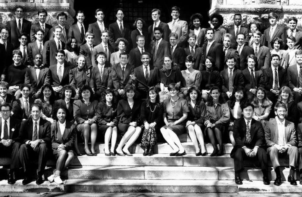 Barack Obama đặt chân đến trường Luật Harvard (HLS) vào mùa đông năm 1988. Ở tuổi 27, cậu già hơn hầu hết sinh viên trong trường. Ở Mỹ, muốn học luật, sinh viên phải có một bằng đại học ngành khác trước. Hầu hết sinh viên đi học luật ở độ tuổi 22-25, khi mới tốt nghiệp đại học. Barack Obama hơi khác một chút. Sau khi tốt nghiệp ngành Chính trị học ở Đại học Columbia (New York) năm 1983, ông dành 5 năm làm việc như một nhà hoạt động cộng đồng ở Chicago trước khi quyết định đi học luật. Ảnh: Pinterest.