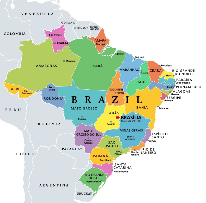 - Nhà nước liên bang: Brazil gồm 26 bang và một quận liên bang (nơi đặt thủ đô Brasilia).