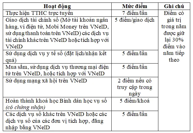 - Các điểm số để xếp hạng công dân dựa trên các tiêu chí như việc công dân cập nhật, xác thực dữ liệu cá nhân, mức độ sử dụng các dịch vụ công và các hoạt động đóng góp cho cộng đồng trên môi trường số.