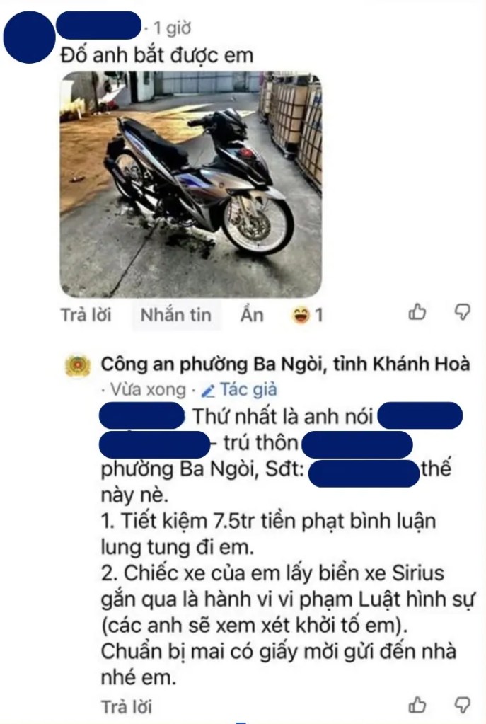 Hiện bài viết lẫn phần bình luận này đều bị gỡ. - Trước đó, trang Facebook của Công an phường Ba Ngòi (Khánh Hòa) cũng có cách phản hồi tương tự. Trước bình luận có nội dung “đố anh bắt được em” (kèm hình ảnh xe máy), trang Facebook này đã nêu rõ họ tên, năm sinh, địa chỉ của người bình luận cũng như thông tin về chiếc xe. Đồng thời nói rõ với người bình luận là “tiết kiệm 7,5 triệu tiền phạt bình luận lung tung đi em”.